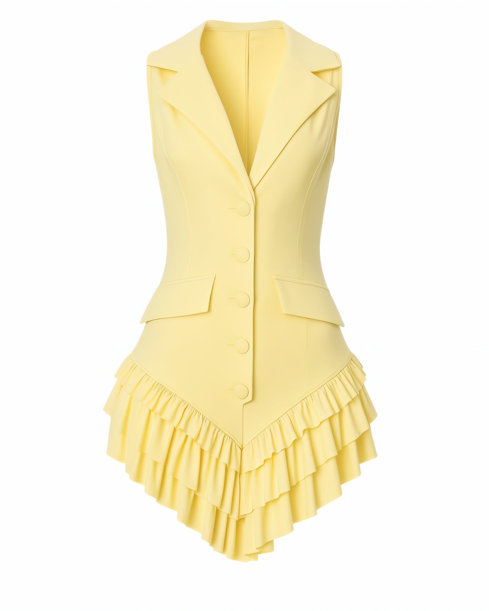 A head-turning blend of sharp tailoring and playful detail. This sleeveless romper sculpts the waist with a tuxedo-inspired fit and finishes in cascading ruffles for extra flair. Clean lines meet bold curves made to command attention.