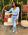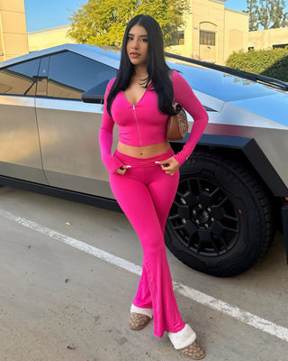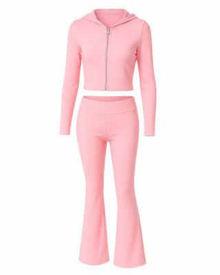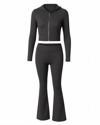 Designed for ultimate comfort and undeniable style. This two-piece set features a figure-flattering zip-up hoodie and chic flare pants, both crafted from a soft, stretch fabric that moves with you. It’s the perfect ensemble for making a statement wherever you go.