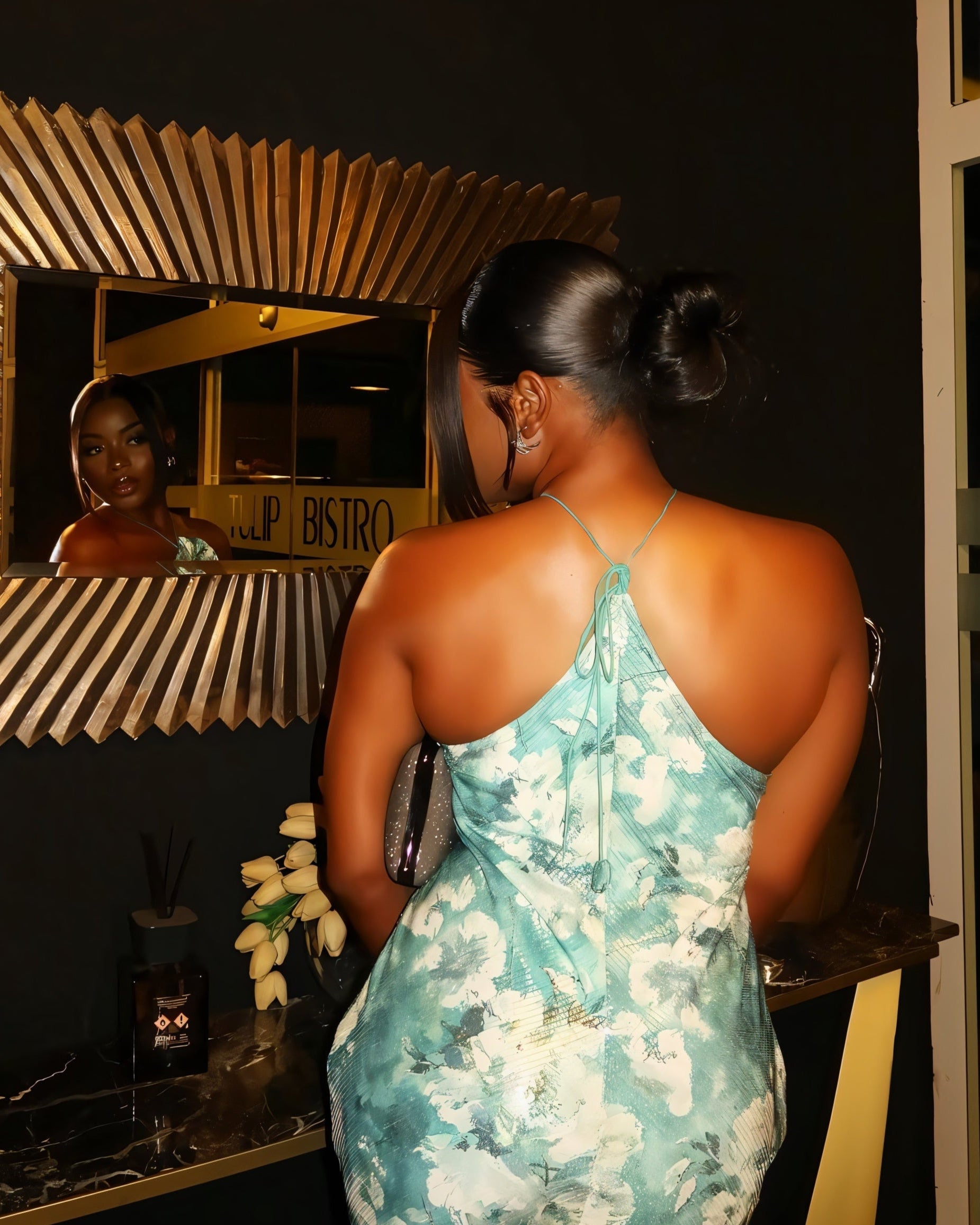 Turn heads in the SHANE Floral Print Satin Maxi Dress, a bold yet elegant piece crafted from soft, luminous fabric. Featuring a high-neck halter with a rose-accented criss-cross neckline, its flowing floral print and curve-hugging silhouette.