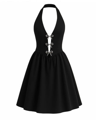 Feminine, flirty, and full of charm, the Talora dress is a modern bombshell classic. This halter-style midi features a deep plunge neckline adorned with three rhinestone-embellished bows that add a dazzling touch. The fit-and-flare silhouette hugs the waist before flowing into a voluminous skirt with soft structure and graceful movement