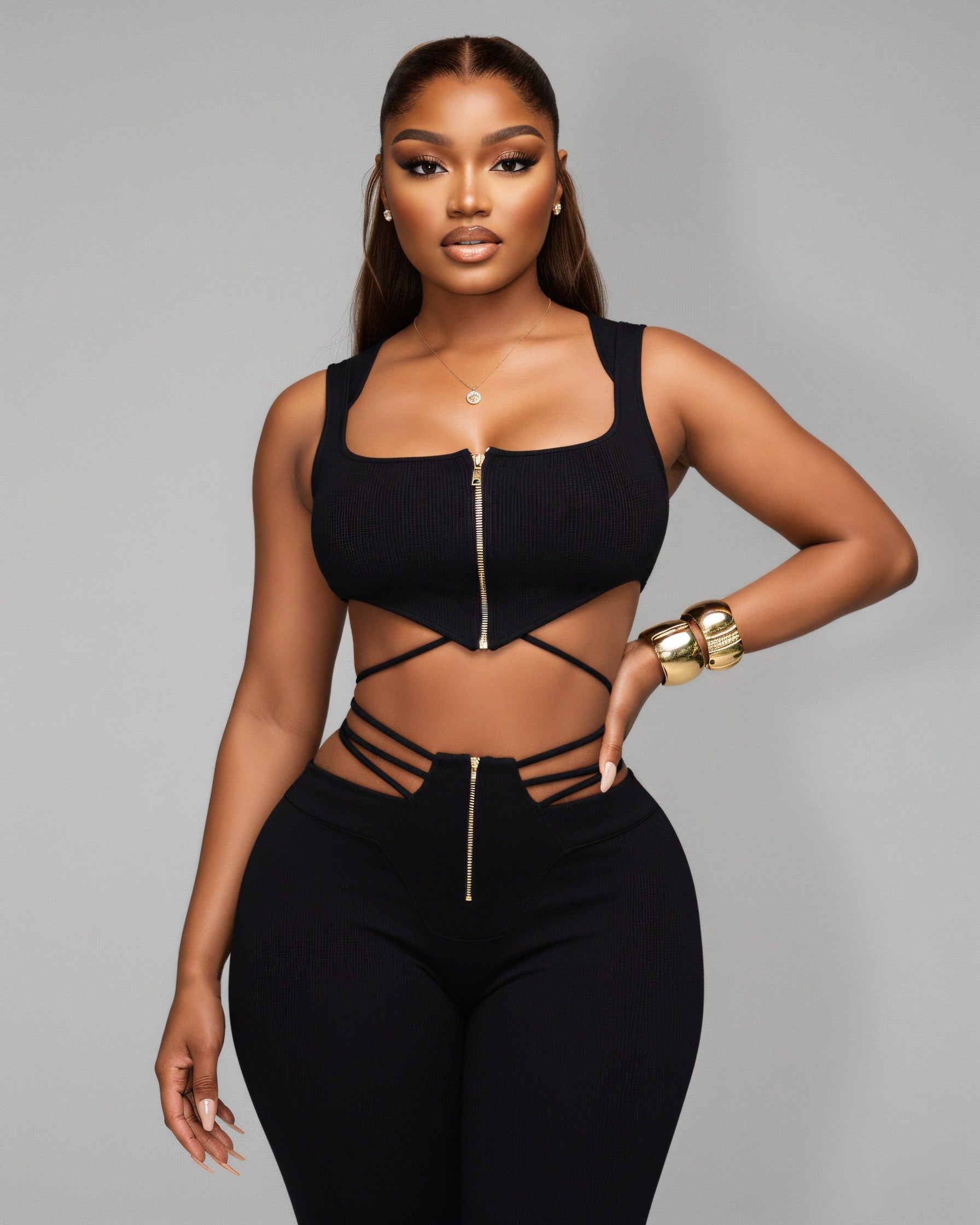 YUNA Ribbed Zip-up Top & Strappy Cutout Pants Set