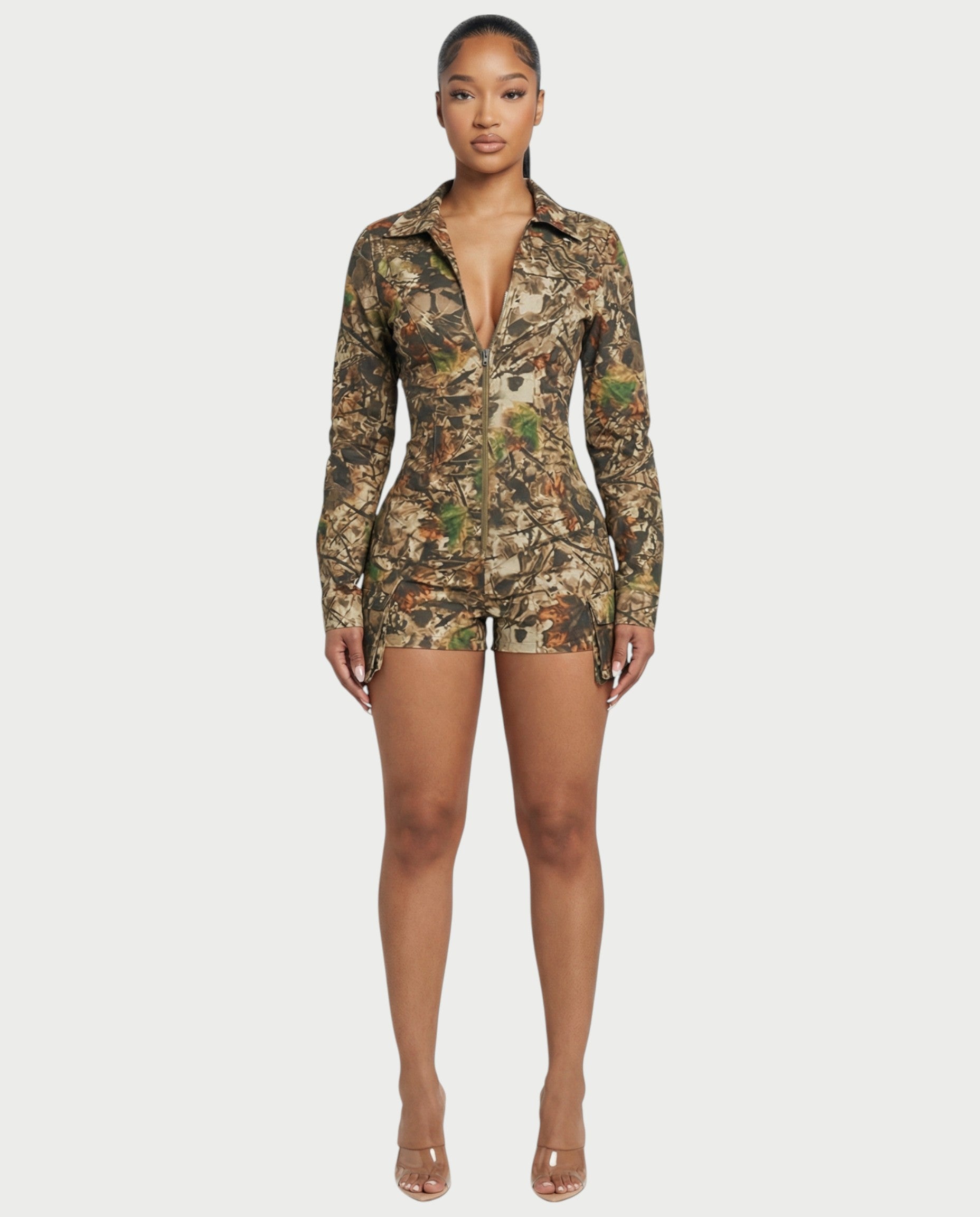 The Zayra Romper brings the heat in a fierce camo print with an adjustable front and a body-contouring fit. The long sleeves and full zip detail add utility vibes, while the ultra-short hem keeps all eyes locked in.